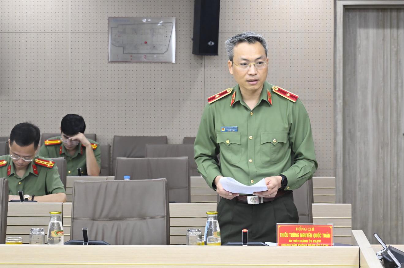 Thiếu tướng Nguyễn Quốc Toản, Chánh Văn phòng Bộ Công an báo cáo tiến độ công tác tổ chức và phục vụ Đại hội đại biểu Đảng bộ Công an Trung ương. Ảnh: Bộ Công an