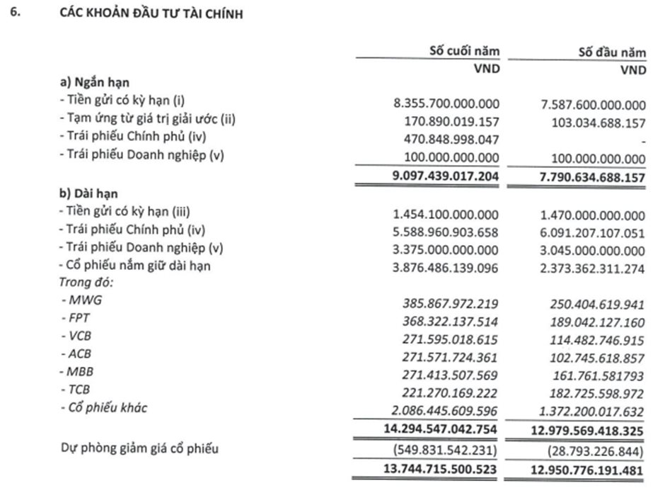 Trên bảng cân đối kế toán cho thấy tổng tài sản của Cathay Việt Nam tại thời điểm cuối năm 2022 là 24.604 tỷ đồng thì có hơn 22.842 tỷ đồng là các khoản đầu tư tài chính. Trong đó, 9.810 tỷ đồng là tiền gửi có kỳ hạn, 6.060 tỷ đồng là trái phiếu chính phủ, 3.475 tỷ đồng là trái phiếu doanh nghiệp và hơn 3.876 tỷ đồng là cổ phiếu nắm giữ dài hạn. Giá trị các cổ phiếu nắm giữ dài hạn của Cathay Việt Nam tăng 63% sau 1 năm.