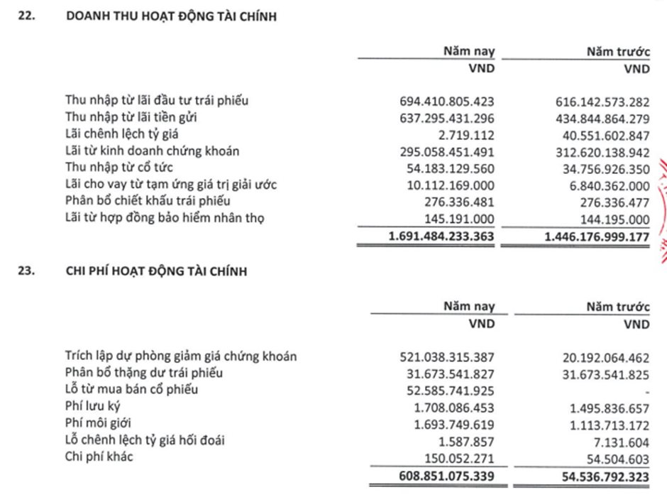 Đáng chú ý, doanh thu tài chính tăng chủ yếu do thu nhập từ lãi đầu tư trái phiếu tăng 12,7% và thu nhập từ lãi tiền gửi tăng 47% so với cùng kỳ còn lãi từ kinh doanh chứng khoán giảm gần 6% xuống 195 tỷ đồng. Chi phí tài chính tăng chủ yếu do khoản trích lập dự phòng giảm giá chứng khoán 521 tỷ đồng, ngoài ra công ty còn ghi nhận lỗ từ mua bán cổ phiếu gần 53 tỷ đồng.