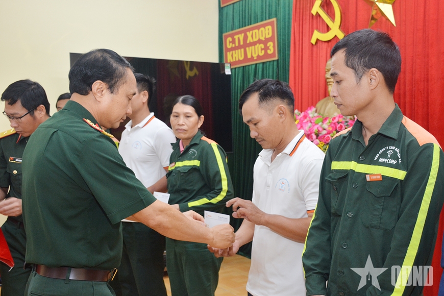 | Đại tá Nguyễn Trọng Úy trao hỗ trợ nhân viên Công ty Xăng dầu Quân đội khu vực 3. |