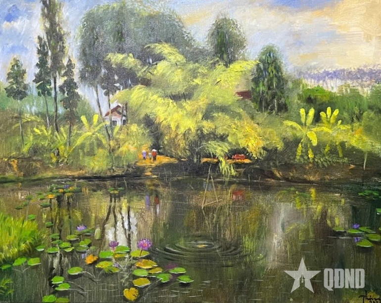 Hình ảnh ao quê thân thuộc hiện hữu trong tranh.