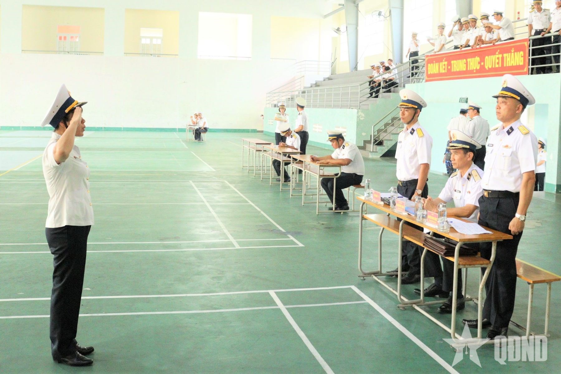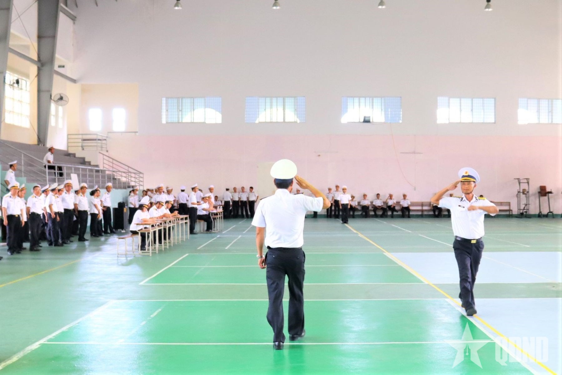 Giảng viên Học viện Hải quân thực hành động tác chào trong kiểm tra điều lệnh. |