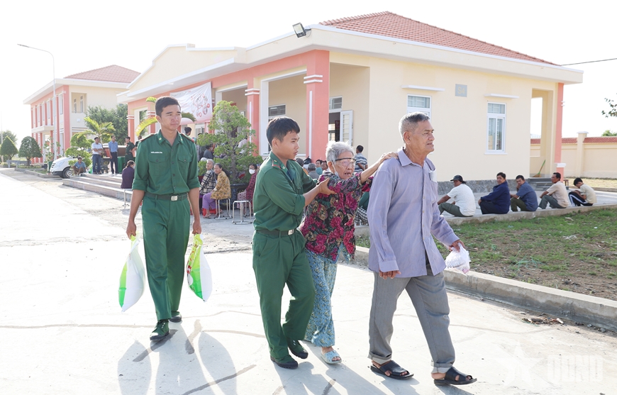 Bộ đội hỗ trợ người cao tuổi di chuyển và mang quà ra về sau khi khám bệnh. |