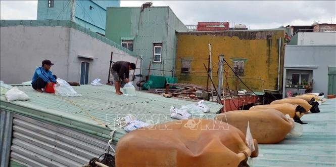 Người dân chủ động chèn, chắn mái nhà để ứng phó bão số 15. |