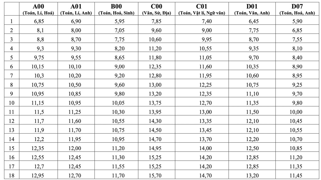 Sáng 22/7, Bộ GD&ĐT đã công bố bách phân vị của 7 tổ hợp truyền thống là: A00 (Toán, Lý, Hóa), A01 (Toán, Lý, Anh), B00 (Toán, Hóa, Sinh), C00 (Văn, Sử, Địa), D01 (Toán, Văn, Anh), C01 (Toán, Lý, Văn), D07 (Toán, Hóa, Anh).