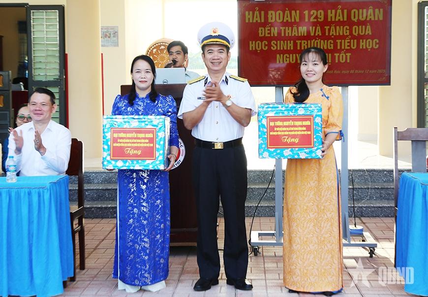 Lãnh đạo Hải đoàn 129 và chính quyền địa phương trao quà tặng học sinh nhà trường. |