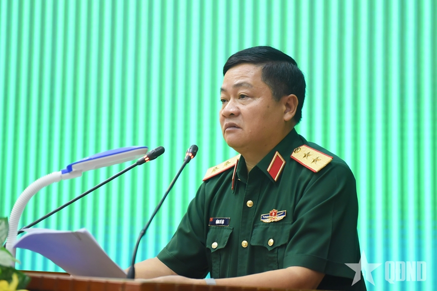 Trung tướng, PGS, TS Đặng Sỹ Lộc, Giám đốc Học viện Chính trị phát biểu tại hội nghị. |