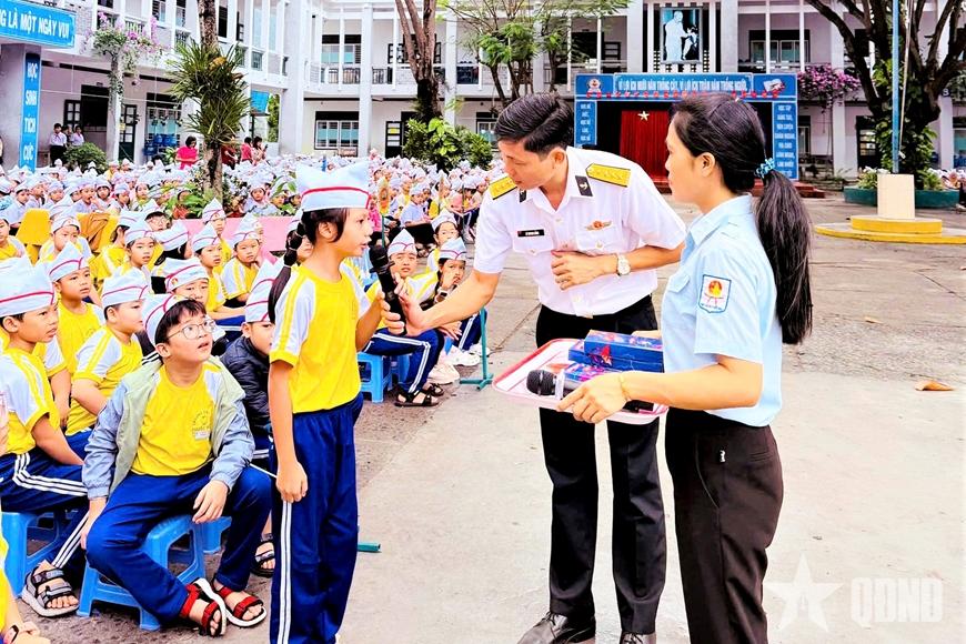Không chỉ dừng lại ở việc cung cấp kiến thức, buổi tuyên truyền còn lồng ghép giao lưu, trao đổi, trả lời câu hỏi, tạo không khí sôi nổi, giúp học sinh chủ động tiếp cận, tìm hiểu về lịch sử, truyền thống Quân đội và biển, đảo Việt Nam.