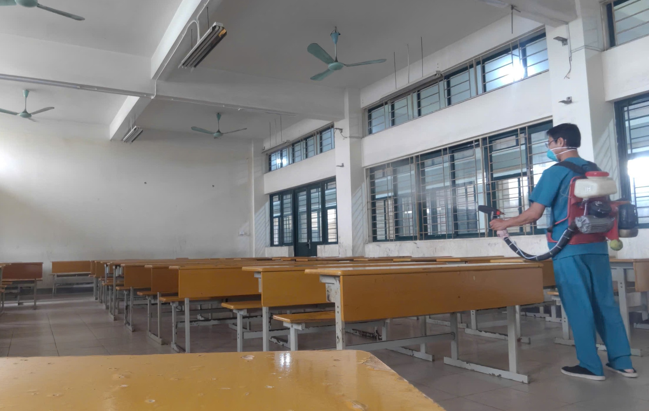 Ông Ngô Hùng Sơn, Trạm Y tế phường Hai Bà Trưng phun thuốc diệt muỗi phòng, chống bệnh sốt xuất huyết tại trường học trên địa bàn phường. Ảnh: PV.