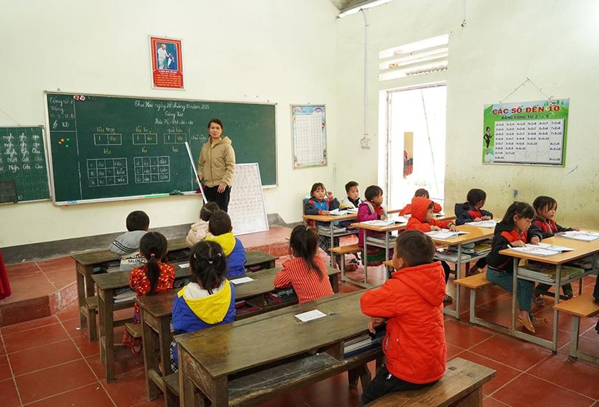 | Học sinh điểm trường thôn Cò Súng, xã Sơn Vĩ (Tuyên Quang) học tập trong điều kiện cơ sở vật chất còn hạn chế. |