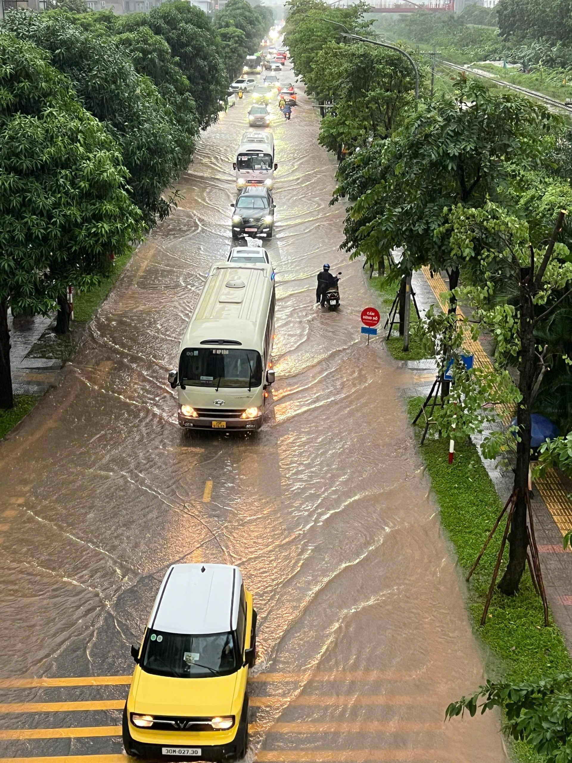 Từ 7h30, mưa to trở lại khiến nước thoát chậm, nhiều tuyến phố xuất hiện úng ngập cục bộ, như Nguyễn Trãi, Phú Diễn, Hoa Bằng, Lê Đức Thọ, khu vực Mỹ Đình, An Khánh, quốc lộ 32…