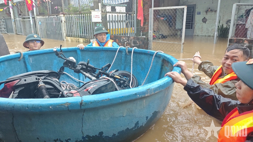 Lực lượng Đồn Biên phòng Hải Vân (Bộ đội Biên phòng TP Đà Nẵng) giúp di dời người, tài sản khu vực Hòa Khánh đến vị trí an toàn. |