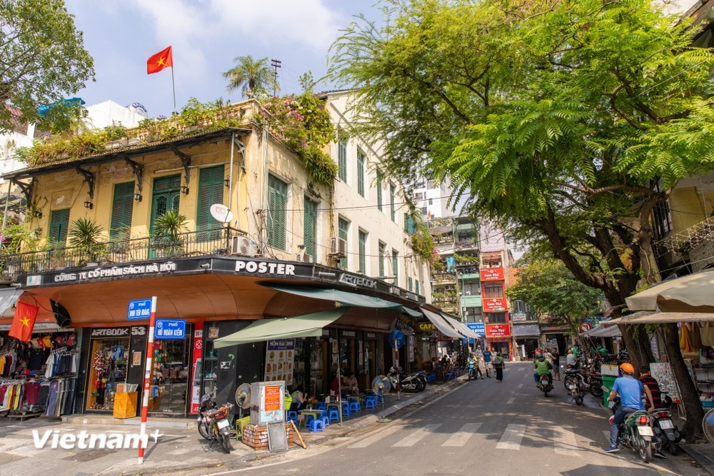 Con phố nằm ở vị trí đắc địa, hướng thẳng ra mặt hồ, đứng từ phố nhìn rõ cầu Thê Húc với dòng người tấp nập qua lại. Phố Hồ Hoàn Kiếm không chỉ nổi bật bởi độ dài khiêm tốn, mà còn mang đậm tính lịch sử và giá trị văn hóa. Những ngôi nhà trên phố vẫn giữ nguyên được dáng vẻ cổ kính, làm nổi bật thêm không gian xưa cũ mà người Hà Nội luôn tự hào. (Ảnh: Bảo Ngọc/Vietnam+)
