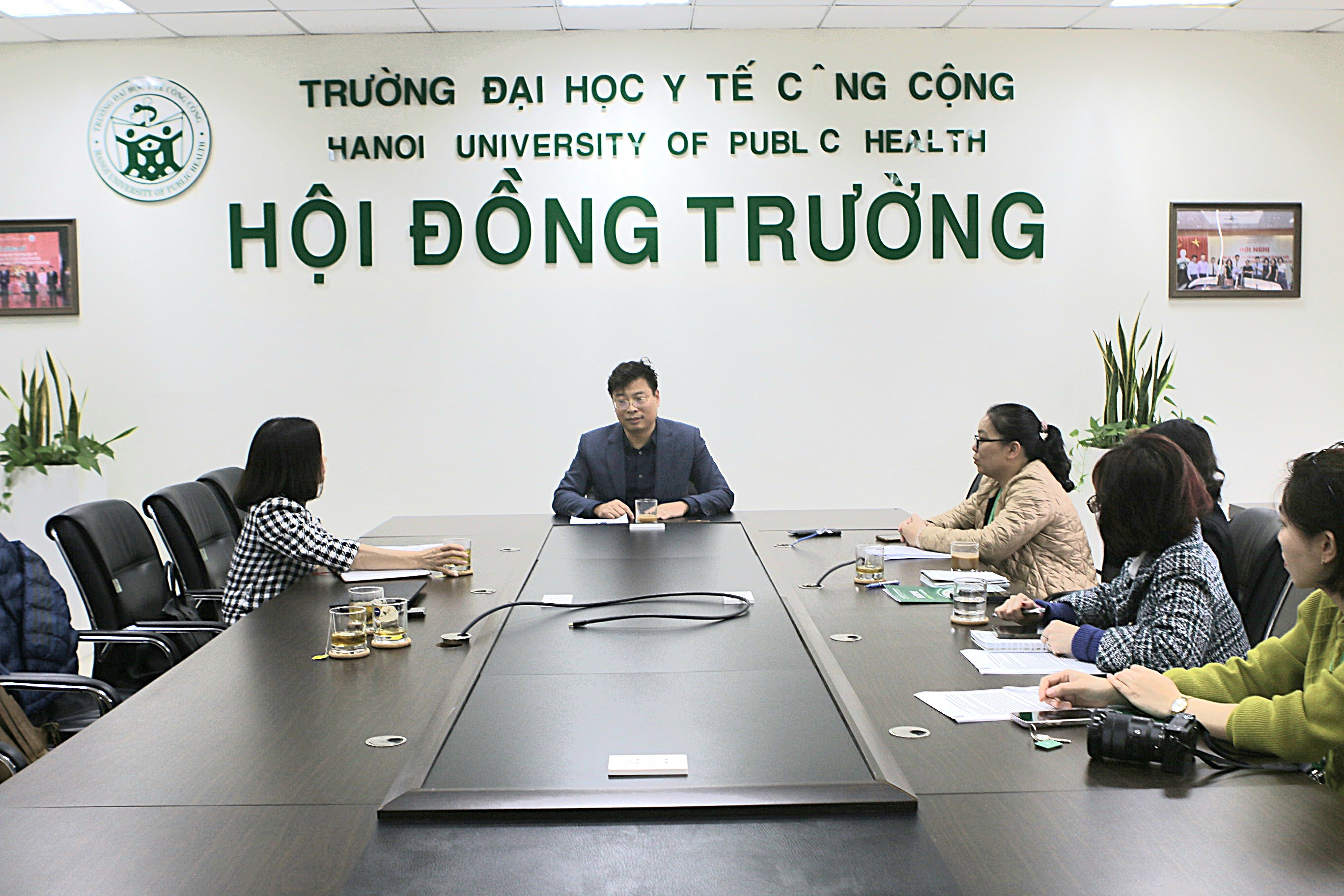 Chủ tịch Hội đồng Trường và một số thành viên của Trường Đại học Y tế Công cộng làm việc với nhóm phóng viên Báo Thanh tra. Ảnh: ĐQ - HN