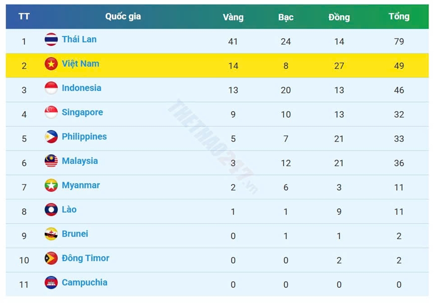 Tính đến trưa nay (12-12), Đoàn thể thao Việt Nam giành được 14 huy chương vàng, 8 huy chương bạc, 27 huy chương đồng, tiếp tục xếp thứ hai trên bảng tổng sắp huy chương SEA Games 33.
