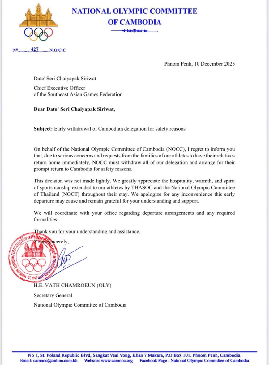 Trong thư, ông Vath Chamroeun, Tổng thư ký Ủy ban Olympic quốc gia Campuchia bày tỏ: “Thay mặt Ủy ban Olympic quốc gia Campuchia (NOCC), tôi rất tiếc phải thông báo rằng, do những lo ngại nghiêm trọng và đề nghị từ gia đình các vận động viên yêu cầu người thân của họ trở về ngay lập tức, NOCC buộc phải rút toàn bộ đoàn Campuchia và thu xếp cho họ trở về nước sớm vì lý do an toàn”.