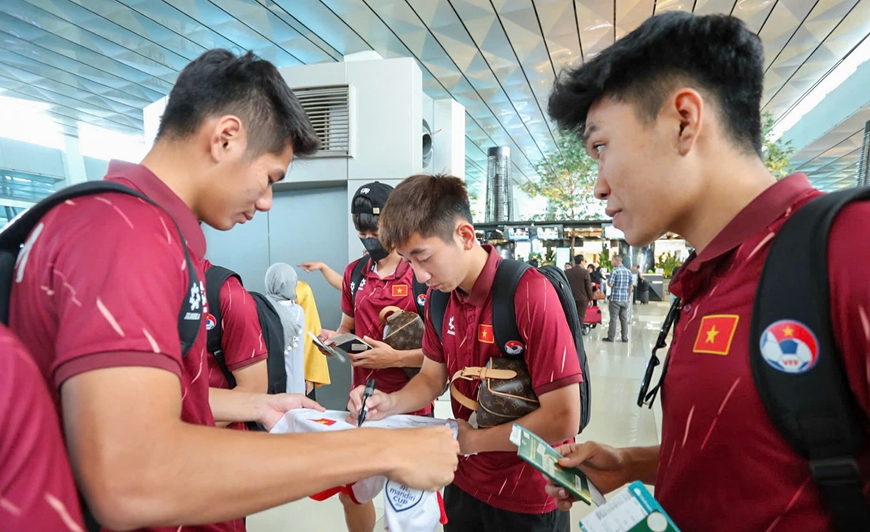 Tại sân bay, các cầu thủ U23 Việt Nam rất bất ngờ khi được người hâm mộ Indonesia chúc mừng và xin chụp ảnh, ký tặng.