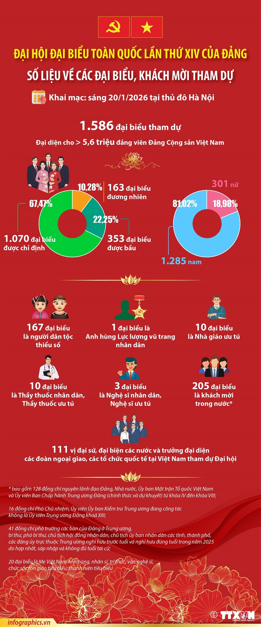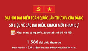 Dự Đại hội đại biểu toàn quốc lần thứ XIV của Đảng Cộng sản Việt Nam có 1.586 đại biểu, đại diện hơn 5,6 triệu đảng viên của Đảng.