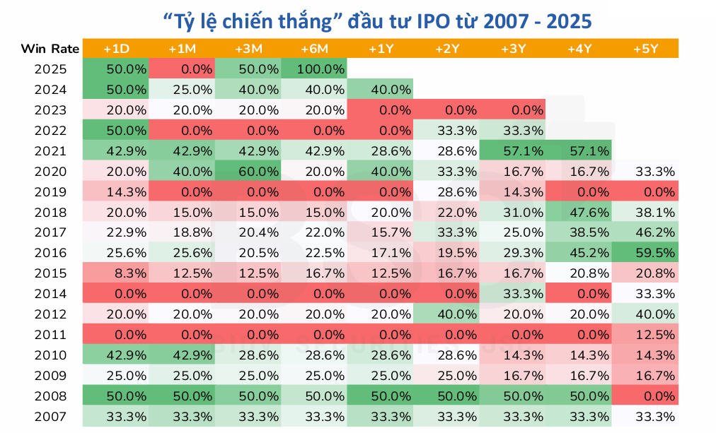 Tổng hợp dữ liệu giai đoạn 2007 - 2025 cho thấy lợi nhuận của các thương vụ IPO biến động mạnh theo bối cảnh thị trường. Việc theo dõi hiệu suất sau IPO ở nhiều mốc thời gian, từ một tháng đến 5 năm, phản ánh một thực tế: IPO không mang lại mức sinh lời ổn định, mà phụ thuộc lớn vào thời điểm tham gia và chất lượng doanh nghiệp.