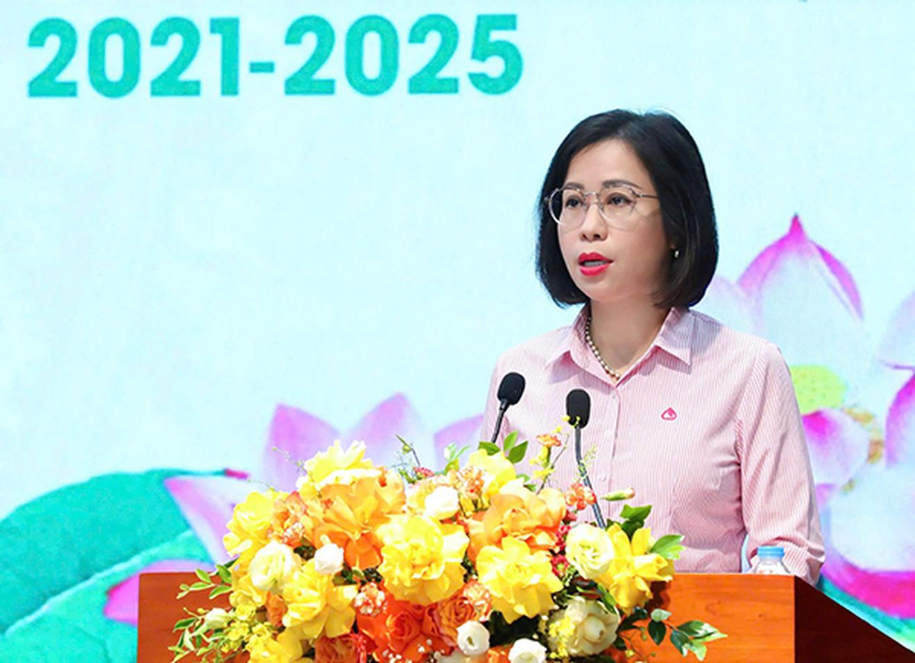 Bà Lê Thị Đức Hạnh, Phó Bí thư Đảng ủy NHCSXH Trung ương - Phó Tổng Giám đốc báo cáo kết quả hoạt động. Ảnh: NĐ