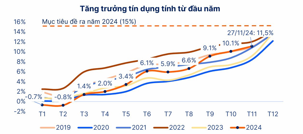 Tính đến hết ngày 27/11/2024, tăng trưởng tín dụng toàn ngành Ngân hàng ước đạt 11,5%. Tổng dư nợ tín dụng tính đến hết tháng 9/2024 đạt hơn 14,8 triệu tỷ đồng, trong đó 27 ngân hàng niêm yết chiếm 11,4 triệu tỷ đồng (77% toàn ngành).