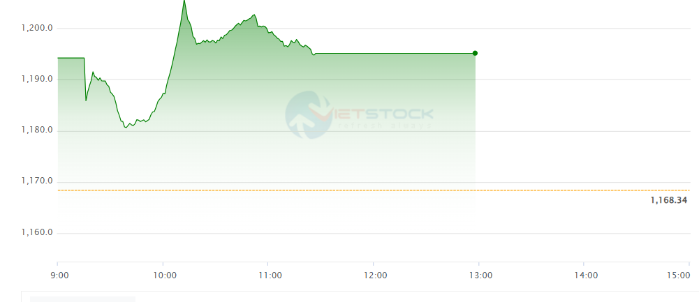 Hết giờ giao dịch sáng, VN-Index tạm dừng ở mức 1.195,09 điểm, tăng 26,75 điểm (2,29%); VN30-Index tăng 34,75 điểm (2,78%), lên 1.284,04 điểm.