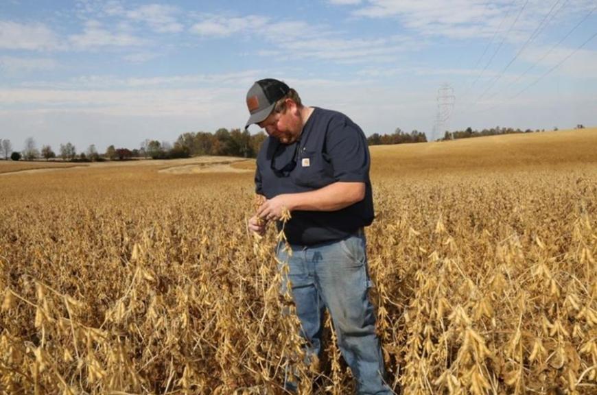 Một nông dân quan sát hạt đậu nành trên trang trại của mình ở Magnolia, bang Kentucky, Mỹ. Ảnh: REUTERS |