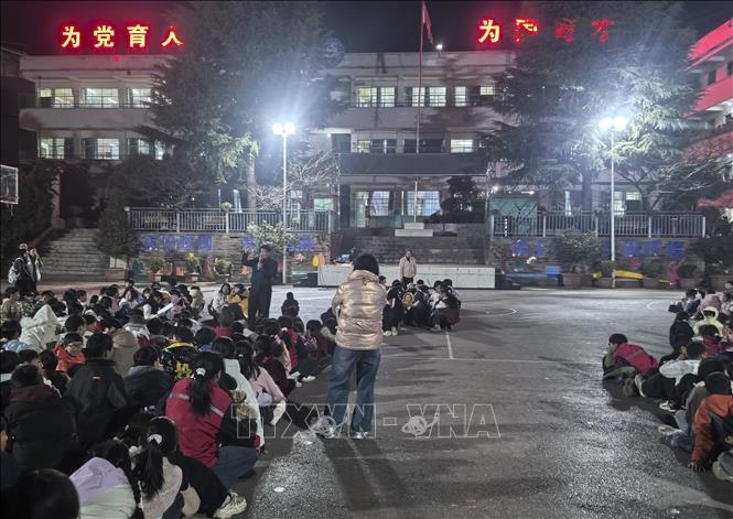Học sinh và giáo viên được sơ tán ra bên ngoài các tòa nhà tại một trường trung học ở huyện Qiaojia, tỉnh Vân Nam, Trung Quốc, sau trận động đất ngày 19-1-2026. Ảnh: TTXVN |