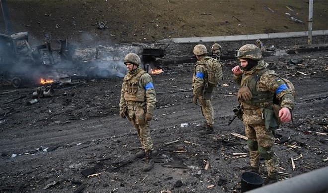 Binh sĩ Ukraine tại khu vực giao tranh với lực lượng Nga ở thủ đô Kiev, ngày 26-2-2022. |
