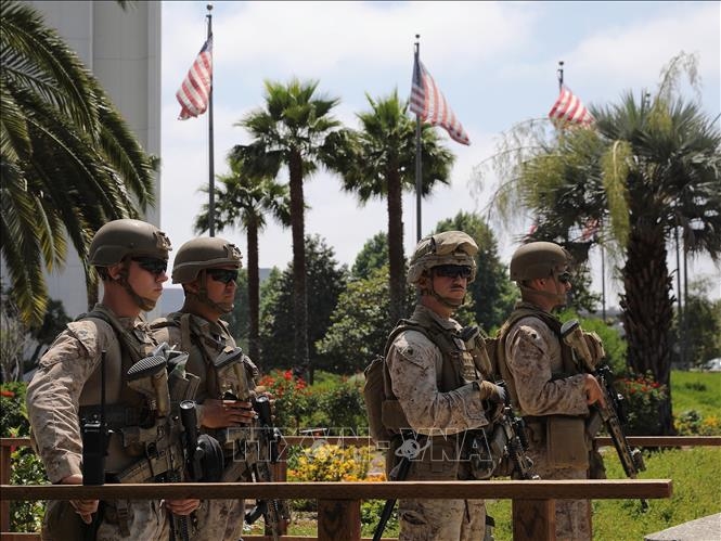 Lính thủy đánh bộ Mỹ gác bên ngoài Tòa nhà liên bang Wilshire ở Los Angeles, bang California, ngày 13-6-2025. |