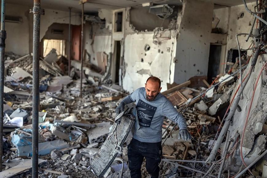 Một người đàn ông đang dọn dẹp đống đổ nát tại khách sạn Comfort ở Baabda, Lebanon, sau khi tòa nhà bị hư hại do một cuộc không kích đêm 5-3. Ảnh: The New York Times |