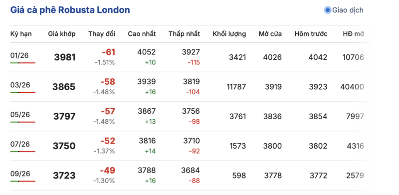 Kết thúc phiên giao dịch gần nhất, giá cà phê Robusta tại London giảm đồng loạt qua các kỳ giao hàng. Cụ thể, kỳ giao tháng 1/2026 giảm 61 USD/tấn, đạt mức 3981 USD/tấn. Trong khi hợp đồng giao kỳ hạn tháng 9/2026 giảm 49 USD/tấn, xuống mức 3723 USD/tấn.