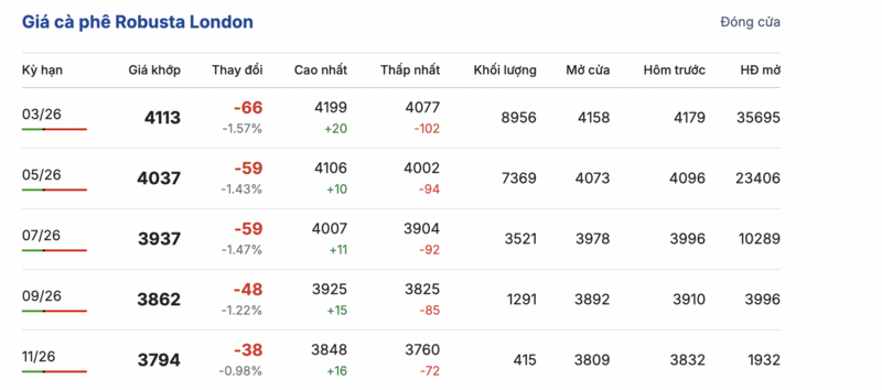 Kết thúc phiên giao dịch gần nhất, giá cà phê Robusta tại London sụt giảm đồng loạt trong các kỳ giao hàng. Cụ thể, kỳ giao tháng 1/2026 đảo chiều giảm đến 66 USD/tấn, xuống mức 4113 USD/tấn. Trong khi đó, hợp đồng giao kỳ hạn tháng 9/2026 cũng giảm nhẹ 38 USD/tấn, đạt mức 3794 USD/tấn.