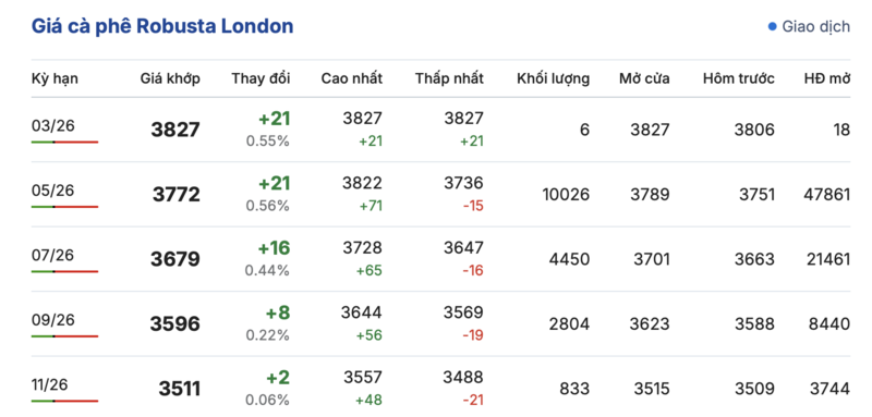 Cụ thể, kết thúc phiên giao dịch gần nhất, giá cà phê Robusta tại London ghi nhận phiên tăng nhẹ đồng loạt trong các kỳ giao hàng. Trong đó, kỳ giao tháng 1/2026 tăng nhẹ 21 USD/tấn, đạt mức 3827 USD/tấn. Tương tự, hợp đồng giao kỳ hạn tháng 11/2026 cũng tăng nhẹ 2,0 USD/tấn, lên mức 3511 USD/tấn.
