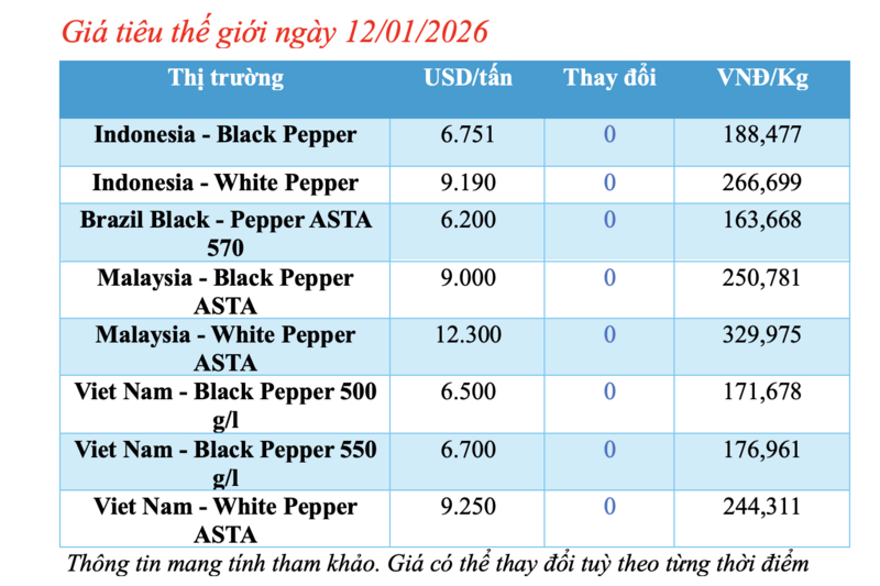 Cập nhật giá tiêu thế giới từ Hiệp hội Hồ tiêu Quốc tế (IPC) sáng 12/01/2026, hồ tiêu xuất khẩu hôm nay không ghi nhận biến động mới. Các thị trường đều ổn định giá so với phiên giao dịch hôm qua.
