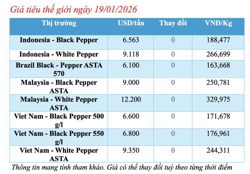 Cập nhật giá tiêu thế giới từ Hiệp hội Hồ tiêu Quốc tế (IPC) sáng 19/01/2026, hồ tiêu xuất khẩu hôm nay không ghi nhận biến động mới. Các thị trường duy trì ổn định so với phiên giao dịch hôm qua.