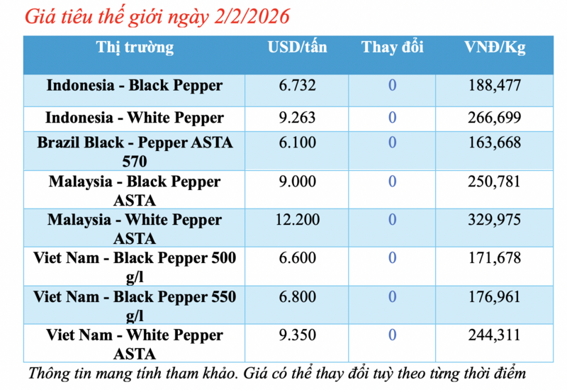 Cập nhật giá tiêu thế giới từ Hiệp hội Hồ tiêu Quốc tế (IPC) sáng 2/2/2026, hồ tiêu xuất khẩu hôm nay không ghi nhận biến động mới. Các thị trường đều duy trì mức giá ổn định so với phiên giao dịch hôm qua.