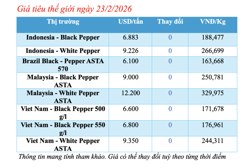 Cập nhật giá tiêu thế giới từ Hiệp hội Hồ tiêu Quốc tế (IPC) sáng 23/2/2026, hồ tiêu xuất khẩu hôm nay không ghi nhận biến động mới. Các thị trường đều duy trì mức giá ổn định so với phiên giao dịch hôm qua.