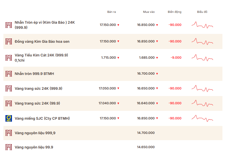 Bảo Tín Mạnh Hải niêm yết giá nhẫn tròn ép vỉ Kim Gia Bảo ở mức 168,5 - 171,5 triệu đồng/lượng (mua vào - bán ra), giảm 700.000 đồng/lượng cả hai chiều mua vào và bán ra so với chốt phiên giao dịch trước.