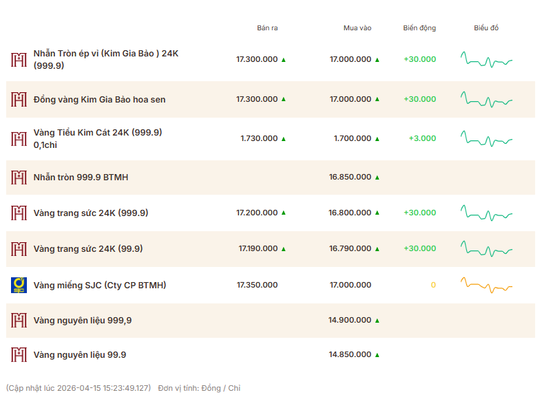 Bảo Tín Mạnh Hải niêm yết giá nhẫn tròn ép vỉ Kim Gia Bảo ở mức 170 - 173 triệu đồng/lượng (mua vào - bán ra), tăng 300.000 đồng/lượng cả hai chiều mua vào và bán ra so với chốt phiên giao dịch trước.