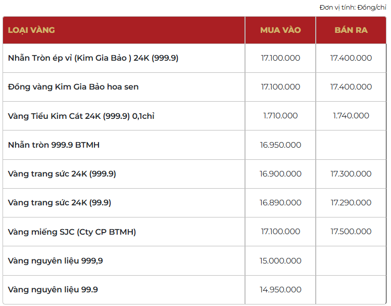 Bảo Tín Mạnh Hải niêm yết giá nhẫn tròn ép vỉ Kim Gia Bảo ở mức 171 - 174 triệu đồng/lượng (mua vào - bán ra), tăng 2,7 triệu đồng/lượng cả hai chiều mua vào và bán ra so với chốt phiên giao dịch trước.