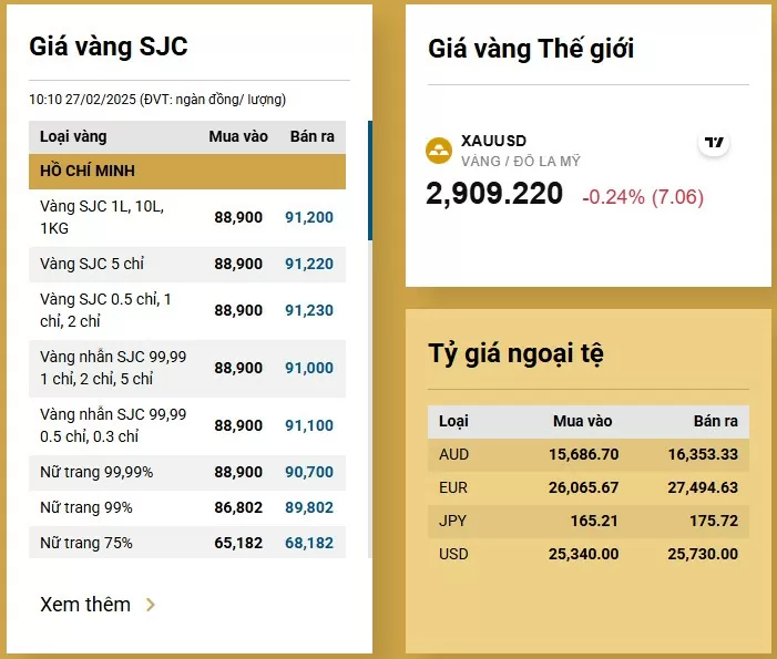 Cùng thời điểm, giá vàng miếng SJC, giá vàng nhẫn trên thế giới đang giao dịch quanh mức 2,909 USD/ounce, giảm khoảng 10 USD so với cùng thời điểm ngày 26/2.