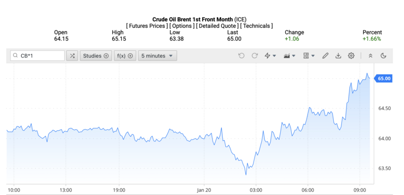Ghi nhận trên Oilprice lúc 4h30 ngày 21/1/2026 (theo giờ Việt Nam), giá dầu Brent đứng ở mốc 65,00 USD/thùng, tăng 1,66% (tương đương tăng 1,06 USD/thùng).