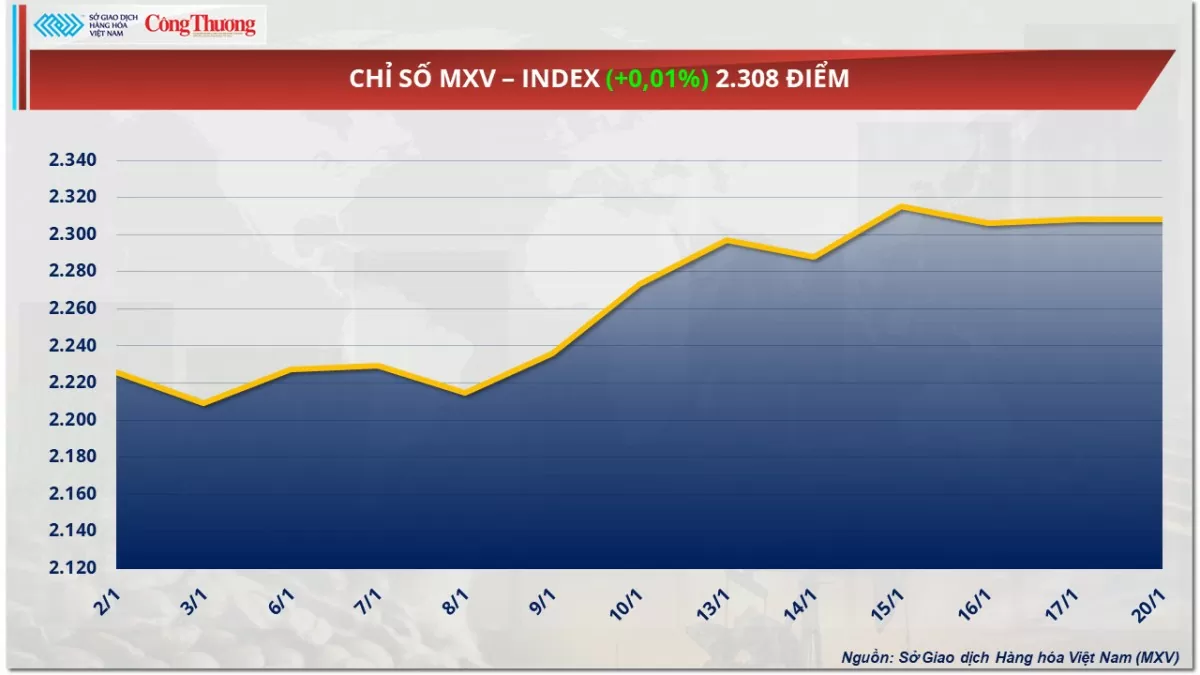 Theo Sở Giao dịch hàng hóa Việt Nam (MXV), thị trường hàng hóa nguyên liệu thế giới khá trầm lắng trong ngày Mỹ nghỉ lễ Martin Luther King, giá một số mặt hàng được tính đến 2h30 sáng nay theo giờ Việt Nam. Tuy nhiên, lực mua vẫn chiếm ưu thế nên chỉ số MXV-Index nằm ổn định ở mức 2.308 điểm. Thị trường kim loại và nguyên liệu công nghiệp đóng cửa sớm và diễn biến tương đối thận trọng trong ngày ông Donald Trump nhậm chức Tổng thống Mỹ.