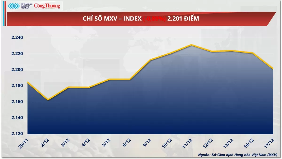 Theo Sở Giao dịch Hàng hóa Việt Nam (MXV), sắc đỏ bao trùm thị trường hàng hóa nguyên liệu thế giới trong phiên giao dịch ngày hôm qua (17/12). Đáng chú ý, trên thị trường nông sản, có tới 5 trên 7 mặt hàng đồng loạt giảm giá, riêng đậu tương giảm phiên thứ ba liên tiếp. Trong khi đó, trên bảng giá kim loại, ngoại trừ bạch kim tăng nhẹ, tất cả các mặt hàng còn lại giá đồng loạt suy yếu. Đóng cửa, chỉ số MXV-Index rơi nhẹ 0,89% xuống 2.201 điểm.