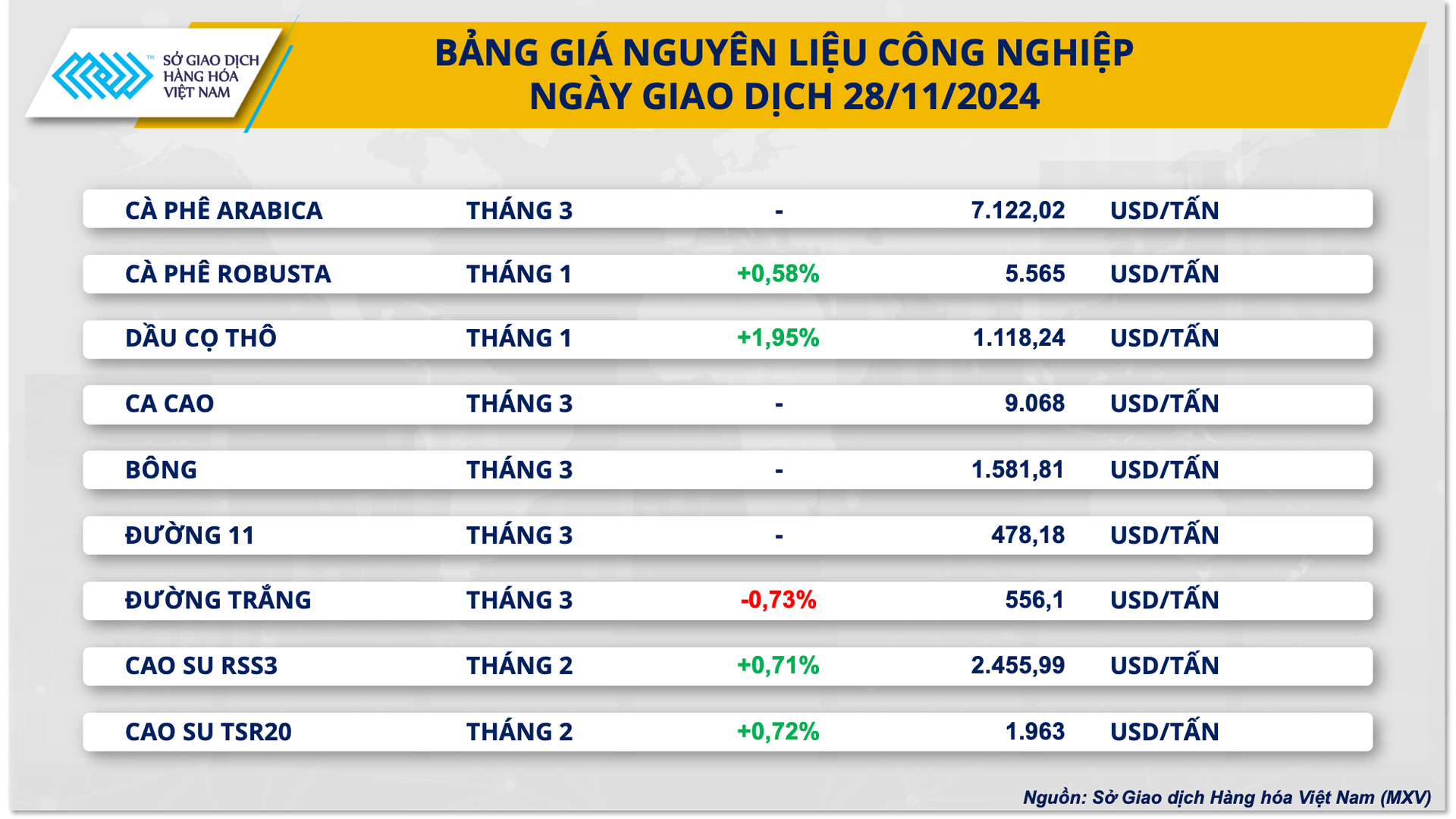 Bảng giá nguyên liệu công nghiệp ngày 28-11. Nguồn: MXV