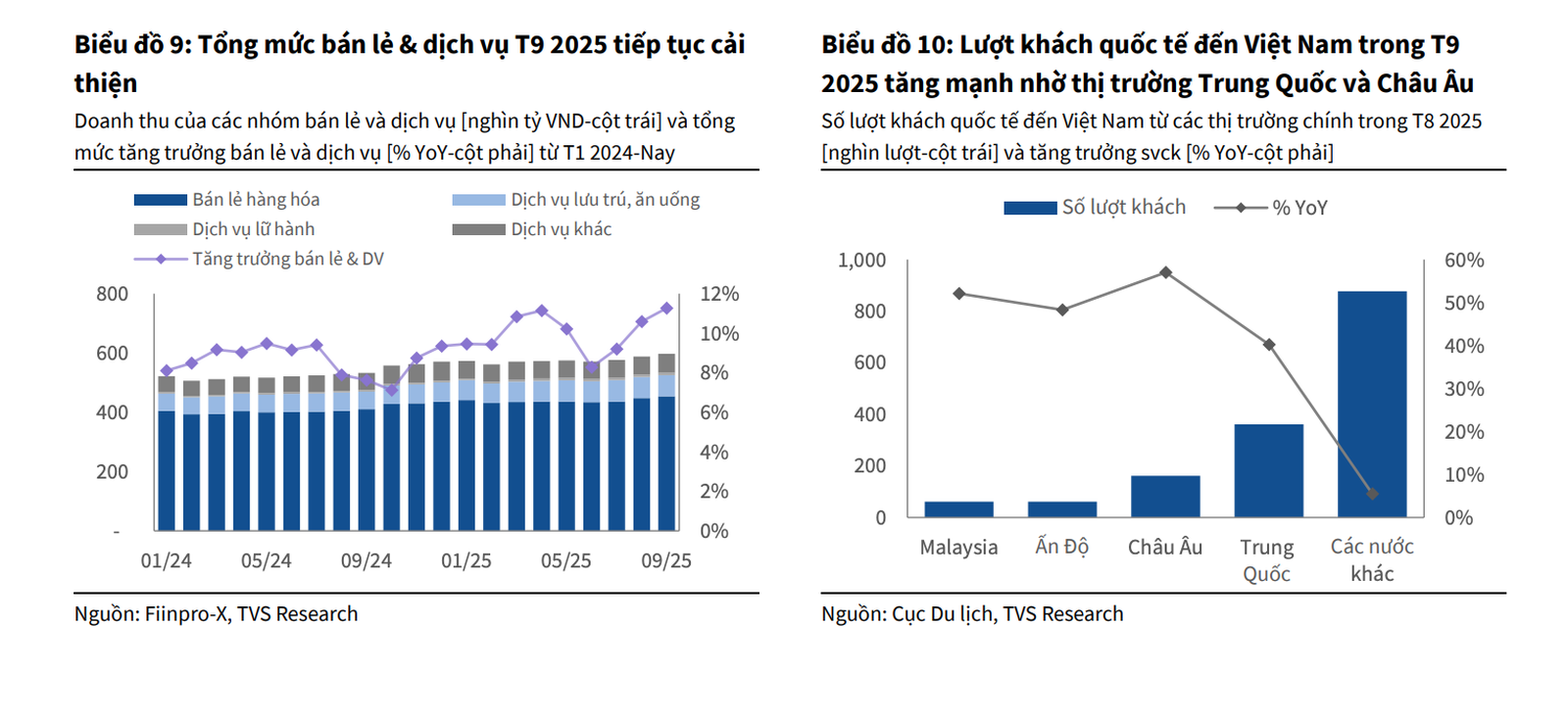 Ngành du lịch và dịch vụ cũng tiếp tục khởi sắc. Doanh thu dịch vụ lưu trú – ăn uống đạt 71 nghìn tỷ đồng (+15%), dịch vụ lữ hành tăng 19,7%, khi lượng khách quốc tế duy trì ở mức cao. TVS Research dự báo tăng trưởng bán lẻ và dịch vụ trong quý IV có thể đạt 10–11%, nhờ mùa cao điểm lễ hội và du lịch cuối năm.