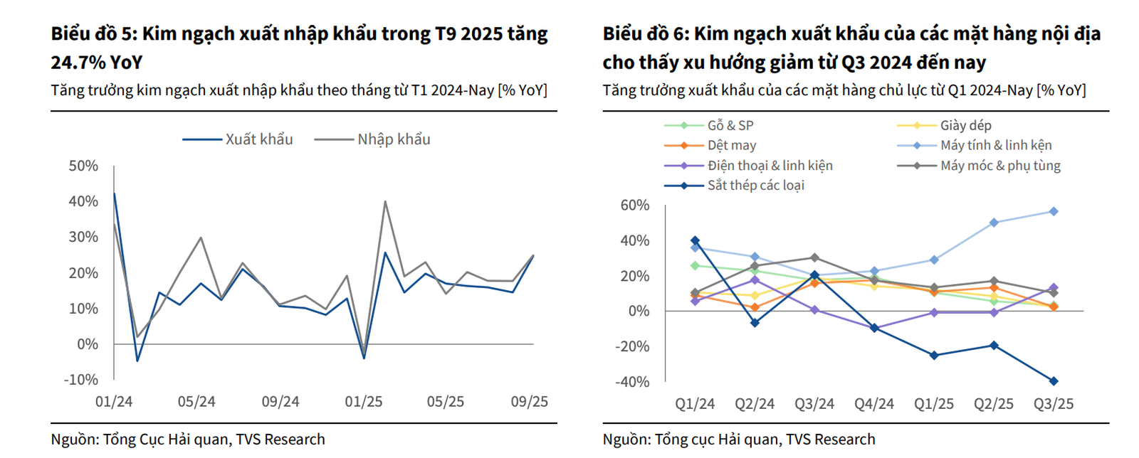 Theo TVS Research, về phía cung, khu vực Công nghiệp – Xây dựng và Dịch vụ lần lượt tăng 9,0% và 8,6% so với cùng kỳ, đóng góp gần 95% vào mức tăng trưởng GDP quý III. Trong đó, ngành chế biến – chế tạo tiếp tục giữ vai trò đầu tàu, hưởng lợi lớn từ đà tăng mạnh kim ngạch xuất khẩu thiết bị điện tử và máy móc.