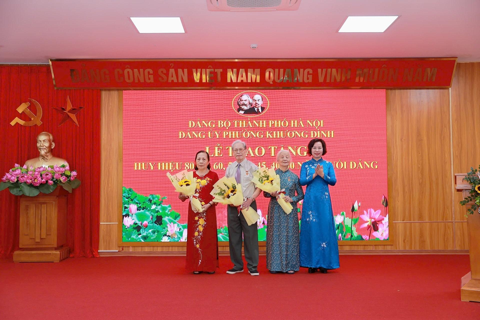 Đợt này, Đảng bộ phường Khương Đình có 188 đảng viên được tặng, truy tặng Huy hiệu Đảng từ 30 năm trở lên. Trong đó, có 1 đảng viên nhận Huy hiệu 80 năm tuổi Đảng; 5 đảng viên nhận Huy hiệu 65 tuổi Đảng; 26 đảng viên được tặng, truy tặng Huy hiệu 60 năm tuổi Đảng; 9 đảng viên nhận Huy hiệu 55 tuổi Đảng; 13 đảng viên nhận Huy hiệu 50 năm tuổi Đảng...