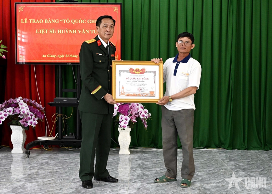 Đại tá Cao Minh Tâm, Phó chính ủy Bộ CHQS tỉnh An Giang trao Bằng “Tổ quốc ghi công” liệt sĩ Huỳnh Văn Tum tới gia đình liệt sĩ. |